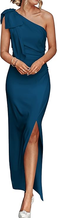 Women's Summer One Shoulder Long Formal Dresses Sleeveless Ruched Bodycon Wedding Guest Slit Maxi Dress