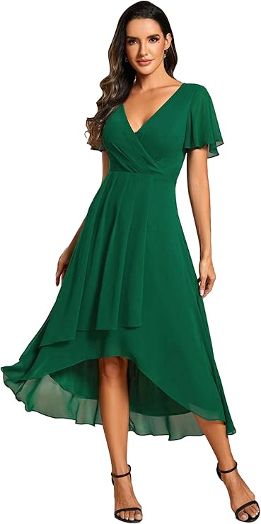 Women's A Line V Neck Ruffle Sleeves Pleated High Low Formal Dresses 02084