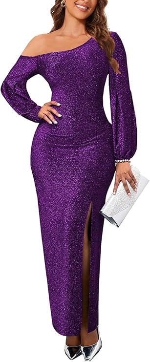 Formal Dresses for Women Elegant Sparkly Sequin Long Sleeve Gowns Sexy Off Shoulder High Split Evening Party Dress,