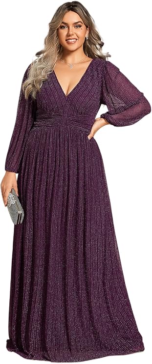 Women's Glitter Long Sleeves Pleated Floor Length Evening Formal Dresses Plus Size 01961-DA