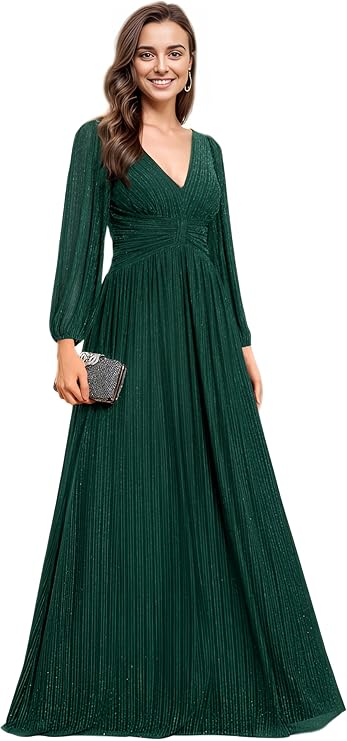 Women's V Neck Ruched High Waist Long Sleeves Floor Length Glitter Evening Dresses 01961