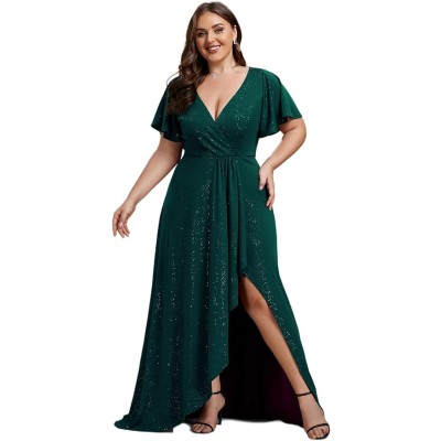 Women's Glitter Stretch V Neck A-line High Low Ruffles Plus Size Formal Dresses with Sleeves 01738-PH