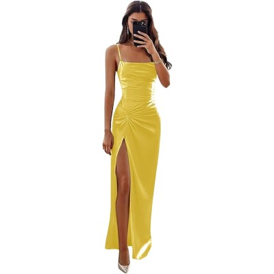 Mermaid Satin Bridesmaid Dresses for Women Wedding Spaghetti Straps Pleated Formal Evening Gown with Slit