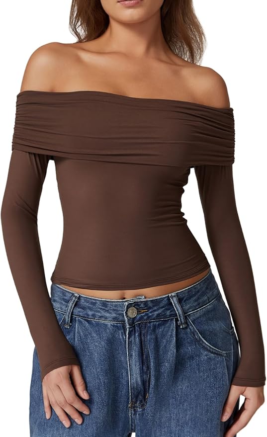 Womens Off The Shoulder Tops Double Lined Long Sleeve T Shirts Slim Fitted Stretchy Crop Top