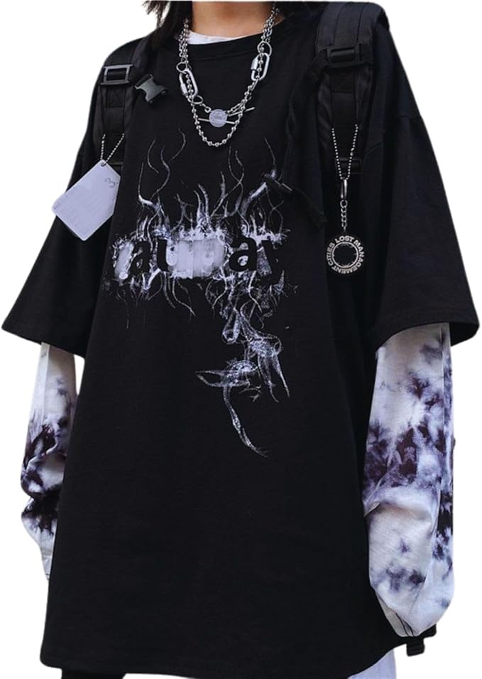 Men's Goth Baggy Shirt Y2k Graphic Long Sleeve Tees Women Punk Fake Two-Piece Pullover Tops Oversized Fall Clothes