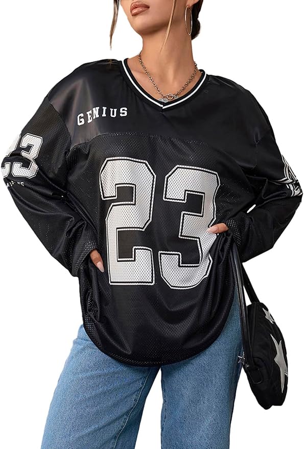 Women's Y2k Jersey Shirts Oversized Mesh Number Graphic Tees V Neck Long Sleeve Blokette T Shirt Tops