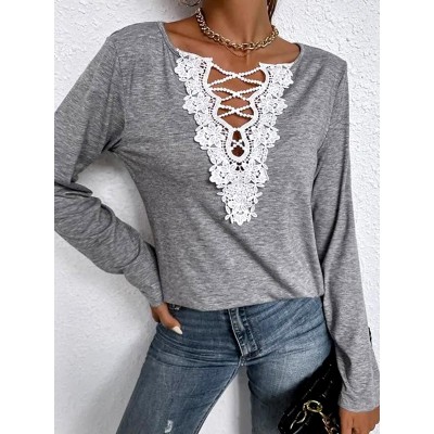 Lace Patchwork V Neck T-Shirt Stylish Long Sleeve in Light Grey