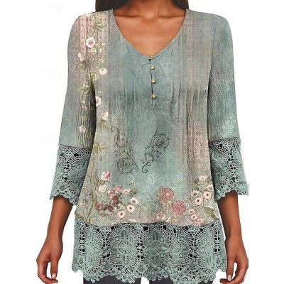 Elegant Ombre Floral Lace Button Tunic with 3/4 Sleeves for Women – Stylish Casual V Neck Summer & Spring Wear