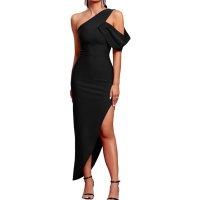 Women's One Shoulder Side Split Asymmetrical Bodycon Sleeveless Midi Party Cocktail Bandage Dress