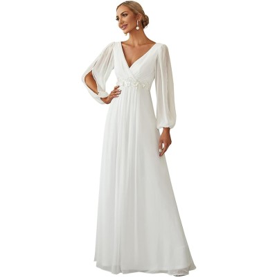 Women's V Neck Long Sleeves Floor Length Ruched Chiffon Formal Dress 00461