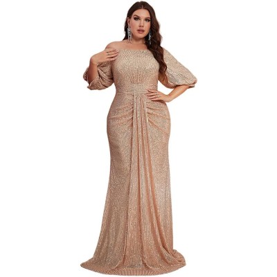 Women's Plus Size Off Shoulder Puff Sleeve Sequin Formal Maxi Dress Evening Party Gowns