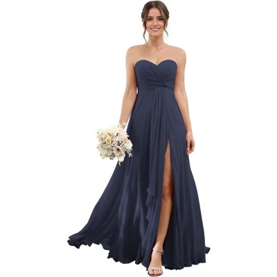 Sweetheart Chiffon Bridesmaid Dresses with Slit Long Pleated Prom Dress Strapless Formal Party Gowns