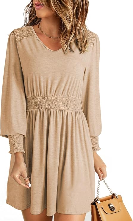 Fall Dresses for 2024 Long Sleeve V Neck Smocked Elastic Waist Casual A-Line Swing Mini Dress with Pockets