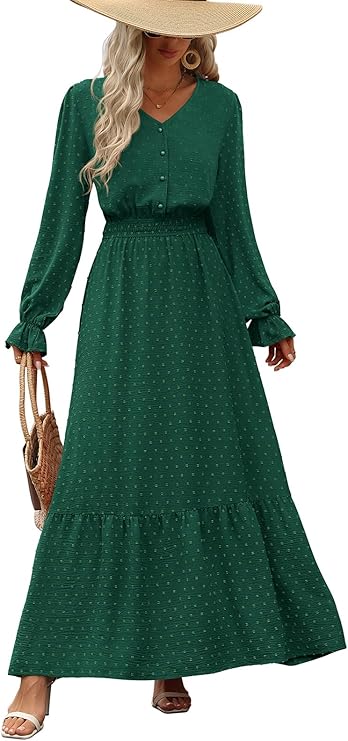 Women's Fall Maxi Dress 2024 V Neck Button Long Sleeve Swiss Dot High Waist Tiered Smocked Flowy Long Dresses