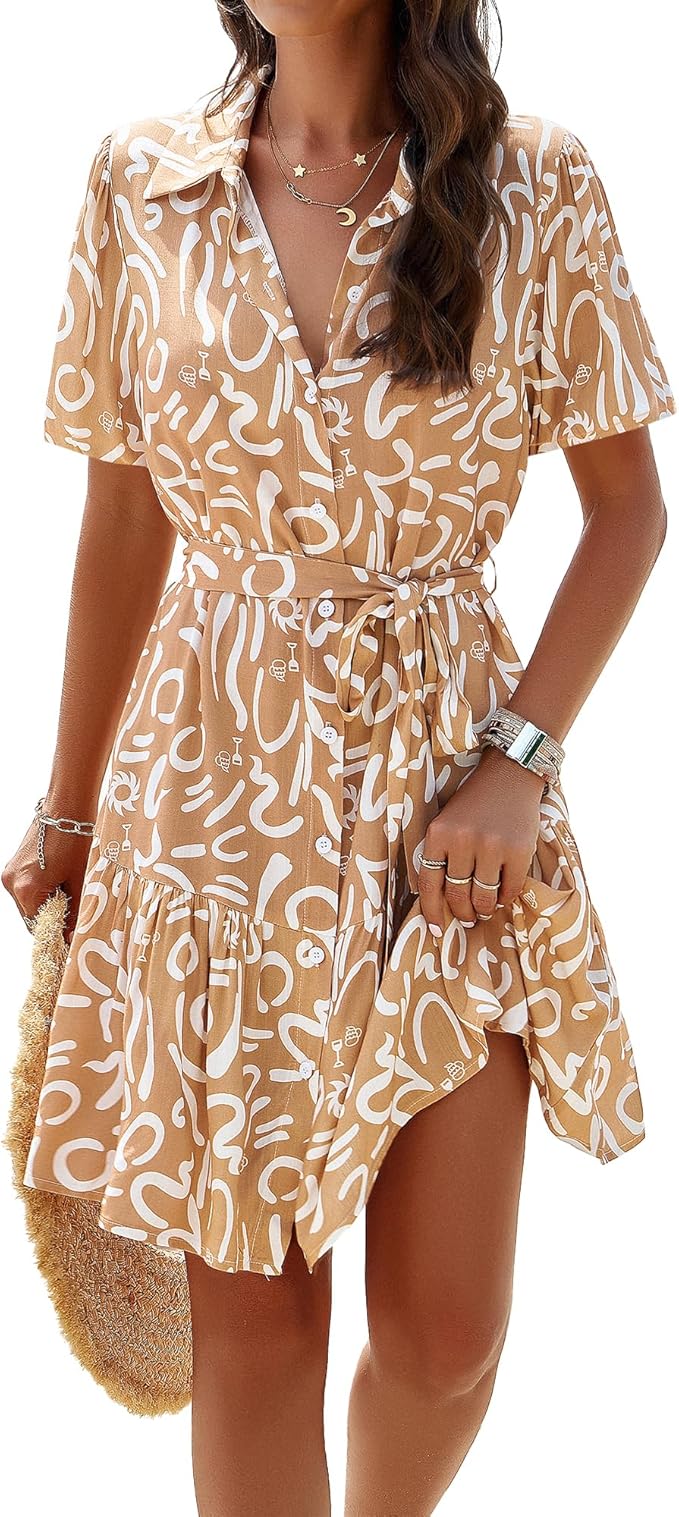 Women's Summer Casual Shirt Dress Short Sleeve V Neck Tie Waist Button Down Mini Dress