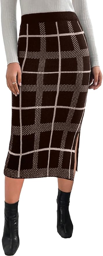 Women's Elegant Plaid High Waist Slit Side Pencil Skirts Knit Pencil Midi Skirts