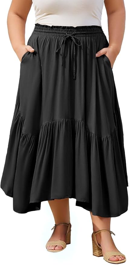 Women's Plus Size Boho Maxi Skirt Tiered Flowy High Waist Long Maxi Skirt with Pockets