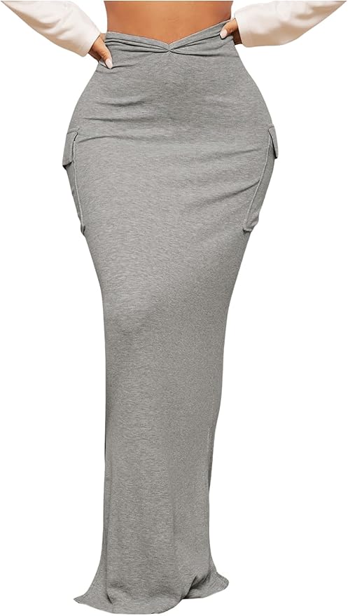 Women's High Waisted Pocket Side Split Hem Bodycon Pencil Skirt Long Maxi Skirts