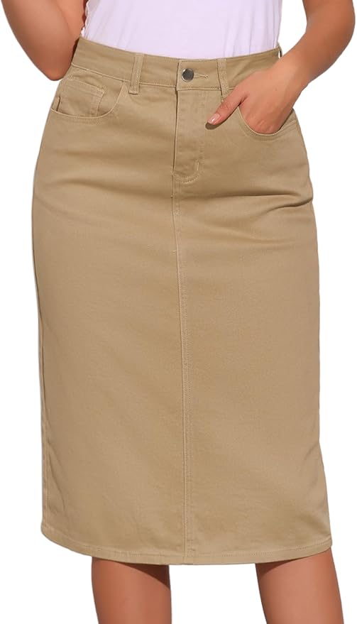 Casual Denim Skirt for Women's High Waist Split Back Pockets Midi Jean Skirts