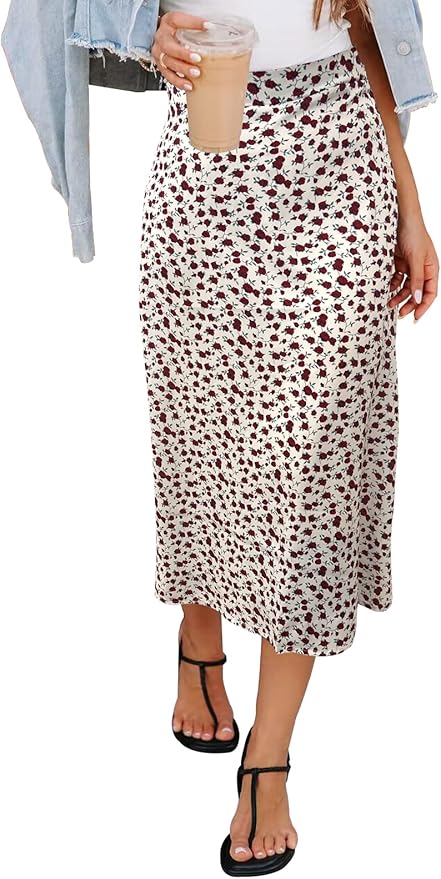 Women’s Floral Print Midi Skirt Casual High Elastic Waist Zipper Vintage Long Boho Skirts for Women