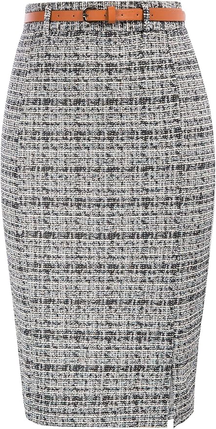 Women's Tweed Pencil Skirt Knee Length High Waisted Skirts with Slit Elegant Skirts with Belt