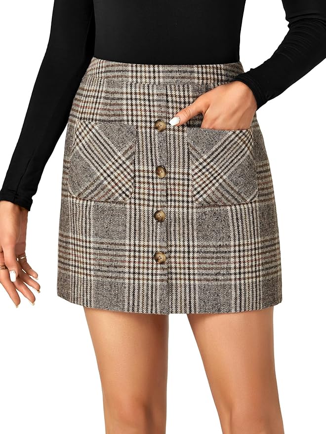 Women's Fall Winter Plaid Mini Skirt High Waist Button Zipper Bodycon Pencil Short Skirts with Pockets