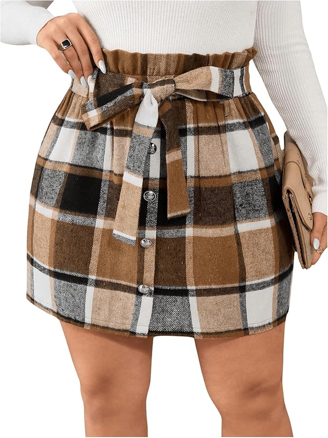 Women's Plus Size Plaid Mini Skirt High Elastic Waist Belted Flannel Going Out Skirts