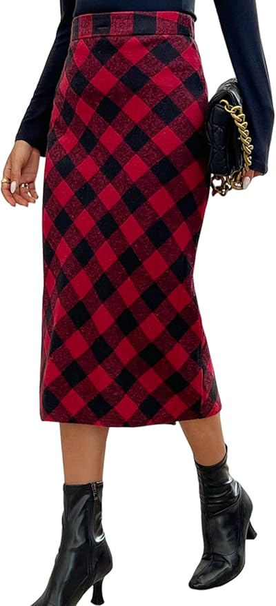 Womens Flannel Plaid Straight Vintage A Line Midi Length Long Pencil Skirt